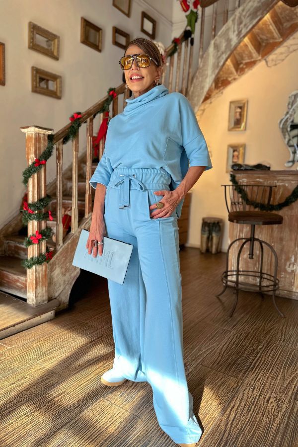 Conjunto confeccionado em moletom, blusa de modelagem quadrada, gola boba, recortes, calça modelo reto, cós largo com aplicação de elástico, cordão para ajuste e bolsos laterais.