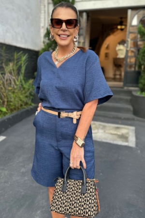Conjunto confeccionado em tecido plano, blusa com decote V, mangas curtas tipo flare, shorts com bolsos laterais, aplicação de elástico no cós traseiro e fechamento dianteiro por zíper e botão.