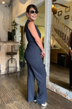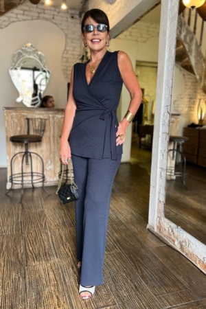Conjunto confeccionado em malha fria canelada, blusa transpassada com faixa para ajuste na cintura, calça reta com aplicação de elástico no cós e bolsos.