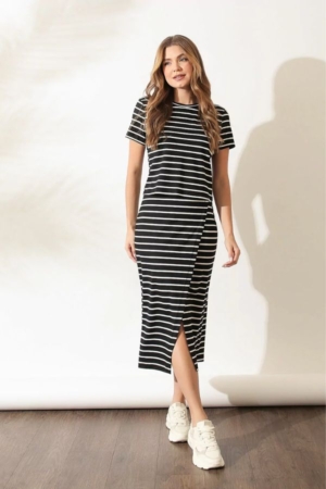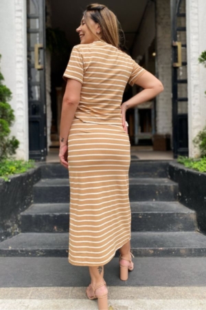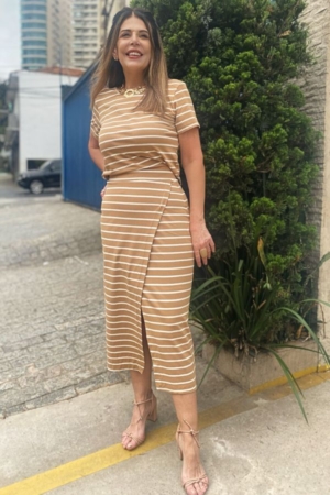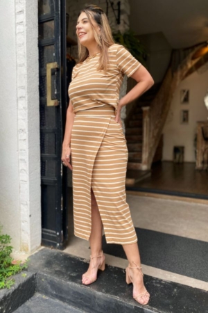 Conjunto Confeccionado Em Malha De Viscose, Blusa Quadrada, Decote Redondo, Saia Midi Modelo Transpassado, Aplicação De Elástico No Cós E Estampa Em Listras.