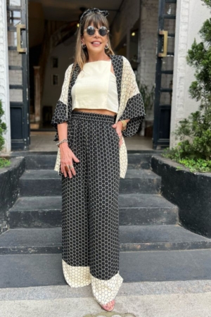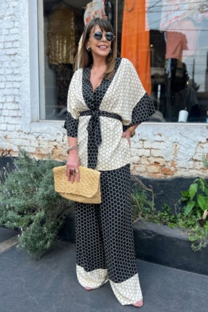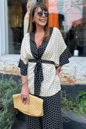 Kimono confeccionado em viscose, comprimento alongado, mangas 3/4, faixa para ajuste na cintura e estampa exclusiva da marca.