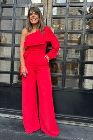 Macacão confeccionado em crepe, decote um ombro com aplicação de babado, calça modelo pantalona, bolsos laterais e fechamento lateral por zíper. Acompanha faixa para ajuste na cintura. Possui forro.