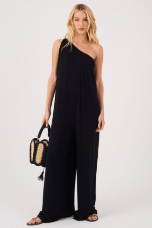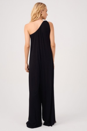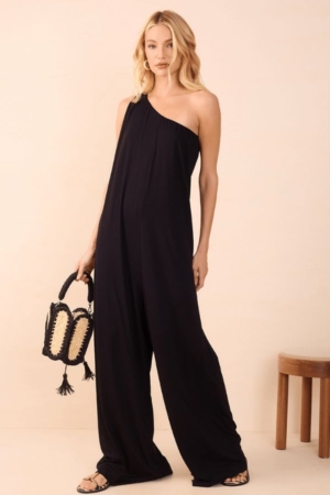 Macacão confeccionado em malha de viscose, modelo pantalona e decote de um ombro.