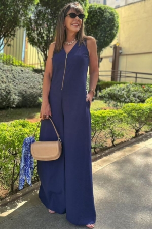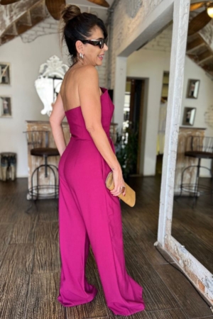 Macacão em alfaiataria, decote tomara que caia em ponta, aplicação de barbatanas para sustentação, bolsos laterais e fechamento lateral por zíper.