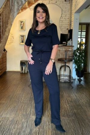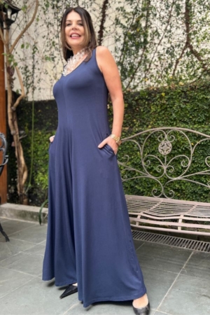 Macacão Confeccionado Em Malha De Viscose, Modelagem Ampla, Decote Traseiro Profundo E Bolsos.