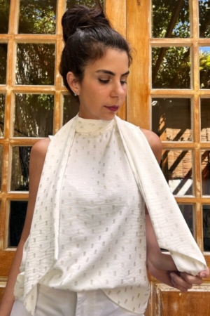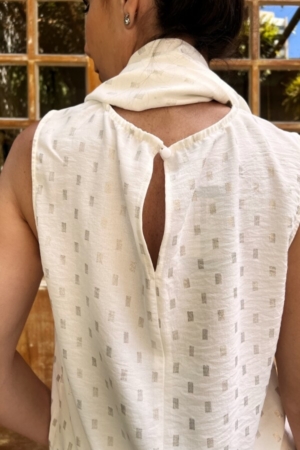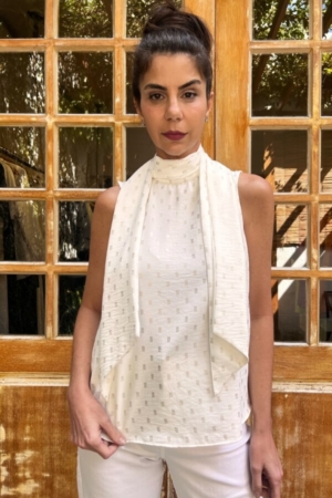 Regata Confeccionada Em Crepe Foil, Com Amarração Na Gola E Fechamento Traseiro Por Botão.