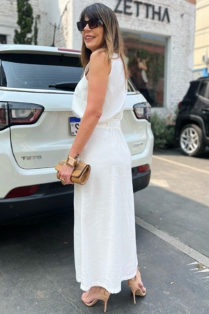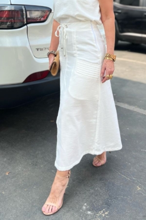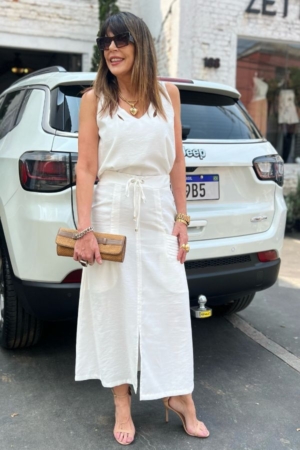 Saia confeccionada em crepe de viscose, modelo evasê, bolsos cargo com detalhe em friso, fenda dianteira e aplicação de elástico no cós traseiro.