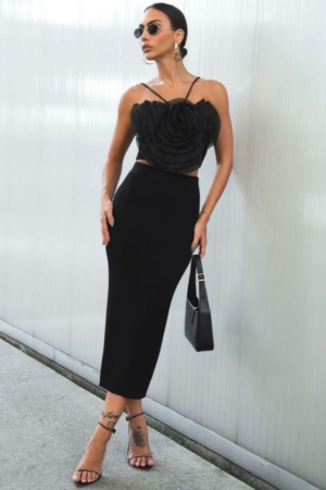 Saia confeccionada em malha canelada, modelo midi e aplicação de elástico no cós.