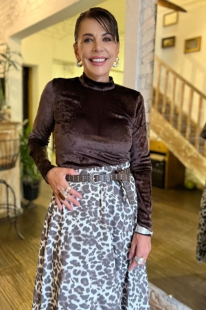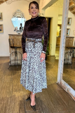 Saia midi confeccionada em algodão, modelo godê, fechamento traseiro por zíper e estampa exclusiva da marca.
