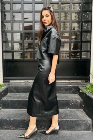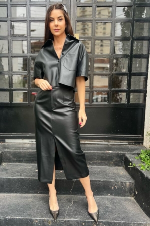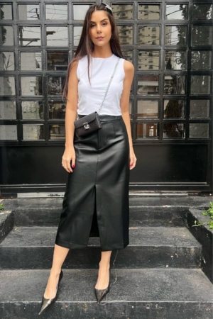 Siai midi confeccionada em couro eco, fenda dianteira, pregas e fechamento dianteiro por zíper e botão.