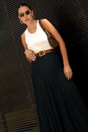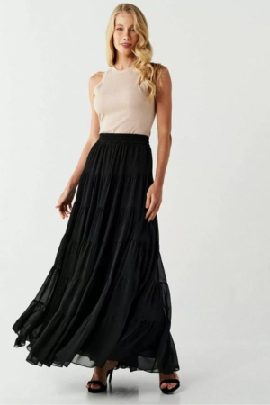 Saia confeccionada em chiffon, modelo godê, com recortes e franzidos e aplicação de elástico no cós. Possui forro.