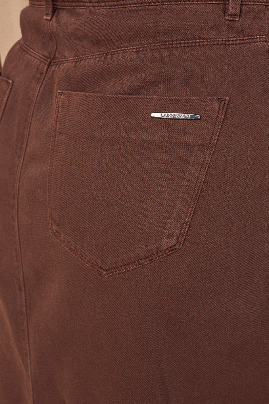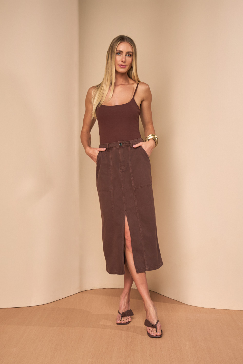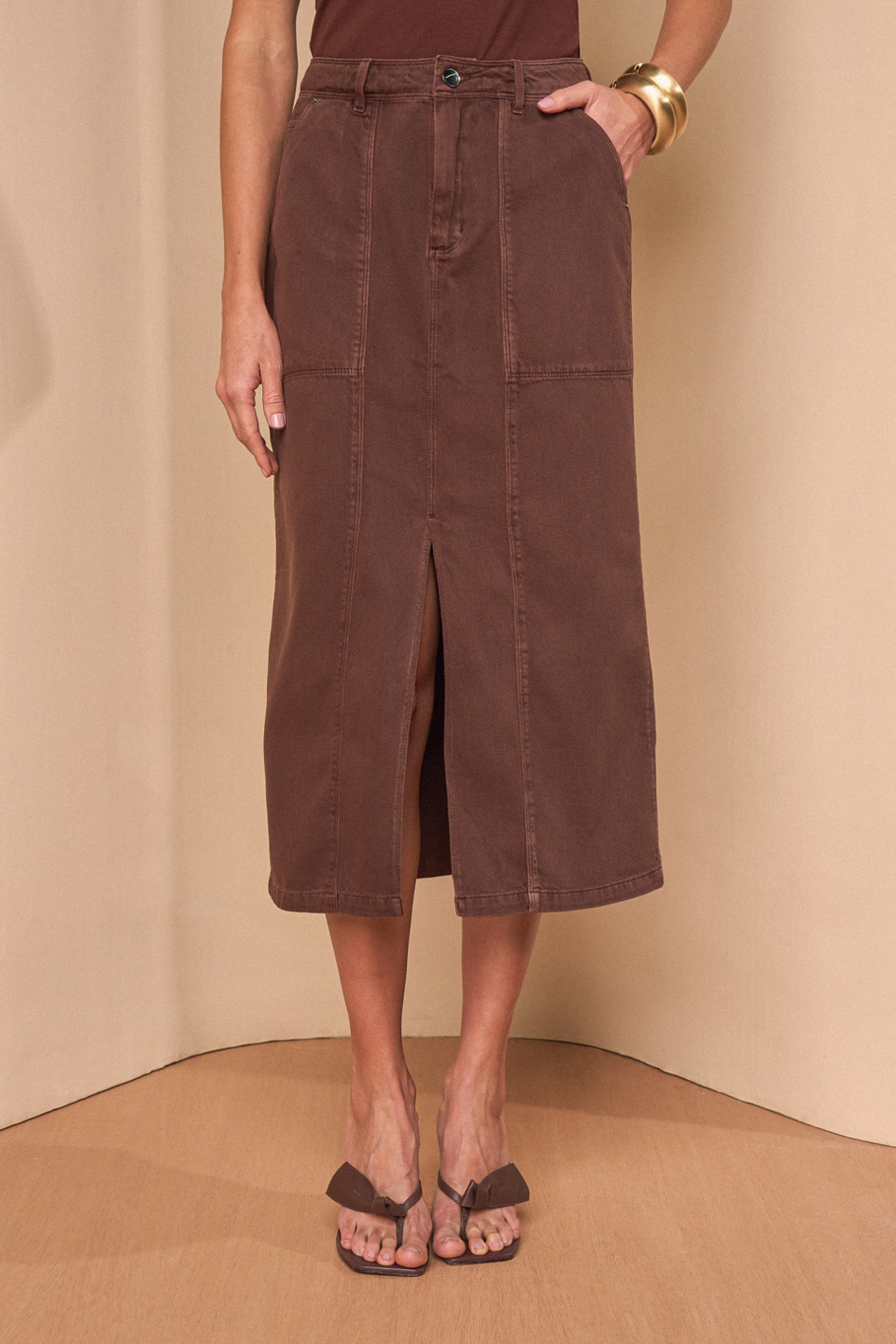 Saia midi confeccionada em sarja, modelo A, fenda dianteira, bolsos laterais e fechamento dianteiro por zíper e botão.