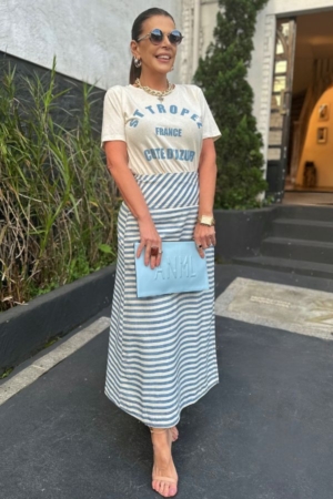 Saia confeccionada em algodão, modelo pareô, bolsos laterais, fechamento por botões e estampa em listras.