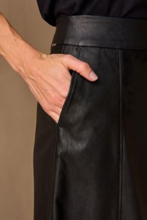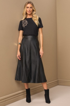 Saia midi confeccionada em PU, modelo evasê, blosos e fechamento lateral por zíper.