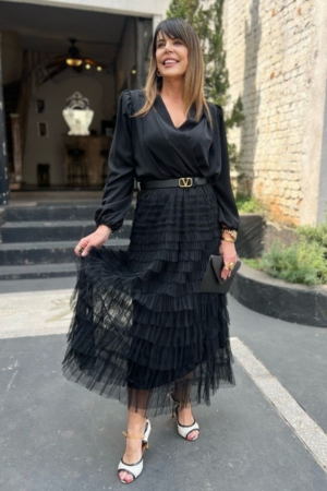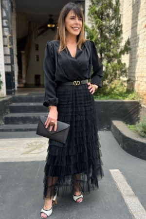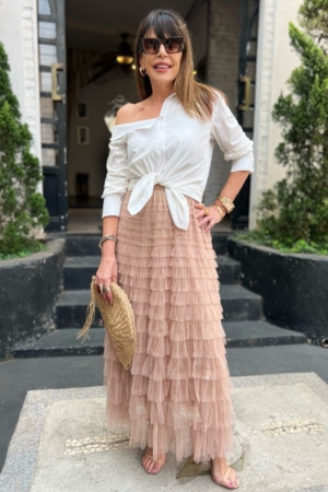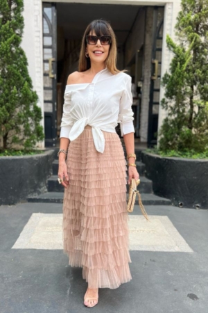 Saia confeccionada em tule em camadas, modelo midi evasê e aplicação de elástico no cós. Possui forro.