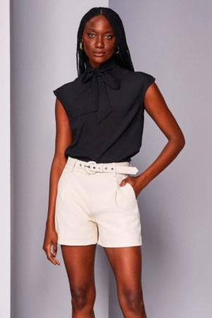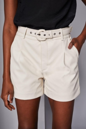 Shorts em couro eco, cintura alta, pregas frontais, bolsos, passantes e fechamento dianteiro por zíper e botão. Acompanha cinto do mesmo materail.