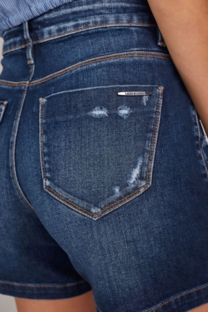 Shorts confeccionado em jeans com elastano, modelo middle, bolsos dianteiros e traseiros, desgastes e fechamento dianteiro por zíper e botão.
