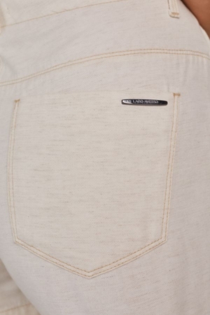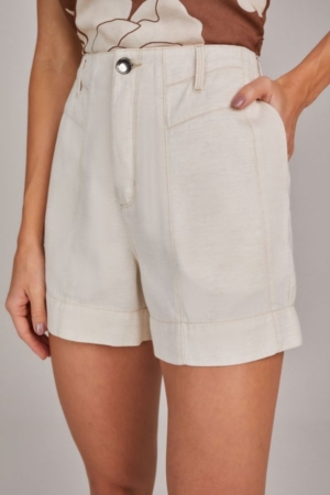 Shorts confeccionado em sarja, modelo mom, recortes com pespontos, bolsos laterais e fechamento dianteiro por zíper e botão.