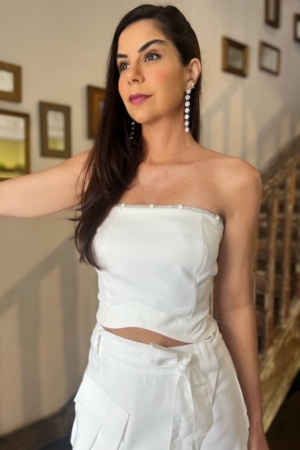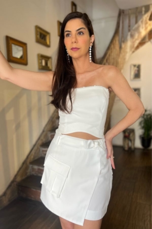Shorts Saia Confeccionado Em Crepe, Modelo Transpassado Com Amarração Lateral, Bolso Frontal E Fechamento Lateral Por Zíper. Acompanha Faixa Para Ajuste Na Cintura.