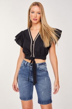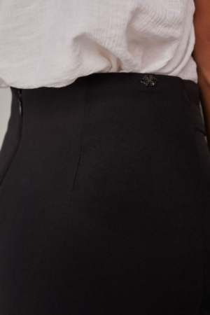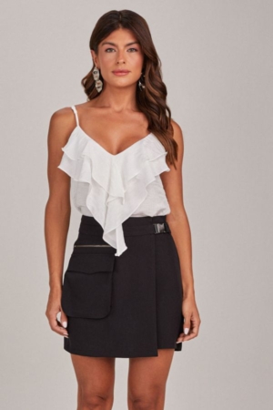 Short Saia confeccionado em sarja creponada, modelo transpassado, detalhe em zíper e fivela, bolso dianteiro e fechamento traseiro por zíper.