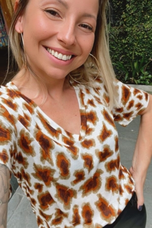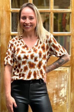 T-shirt Confeccionada Em Malha De Viscose, Decote V, Manga Curta E Estampa Exclusiva Da Marca.