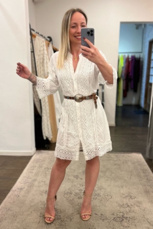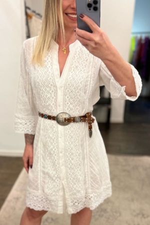 Vestido confeccionado em laise de algodão, com entremeios de guipir, gola padre, mangas 7/8 e cordão para ajuste na cintura.