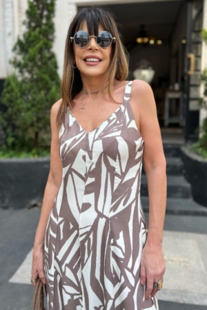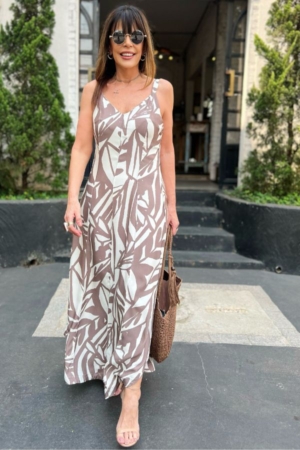 Vestido confeccionado em viscose, decote V, alças com regulagem, recortes para caimento, aplicação de elástico nas costas, bolsos laterais e estampa exclusiva da marca.