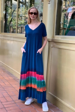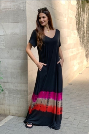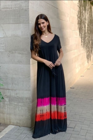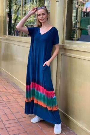 Vestido Confeccionado Em Malha De Viscose, Decote V, Bolsos Laterais E Estampa Tie Dye Na Barra.