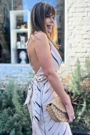 Vestido Midi Confeccionado Em Algodão, Modelo Cachecouer, Decote Traseiro Com Amarração E Estampa Exclusiva Da Marca.
