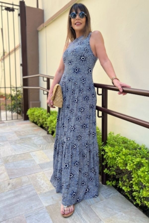 Vestido confeccionado em malha canelada, modelo longo, decote nadador, barra marias e estampa exclusiva da marca.