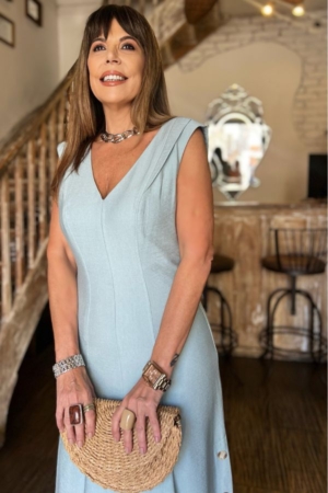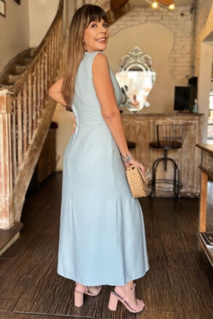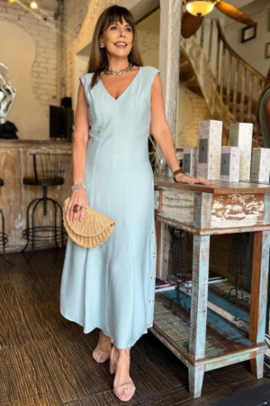 Vestido confeccionado em crepe de viscose, modelo midi, decote V, recortes para caimento, nesgas na saia, aplicação de botões na lateral e fechamento traseiro por zíper. Possui forro.