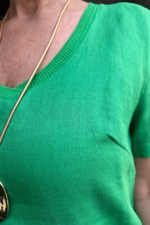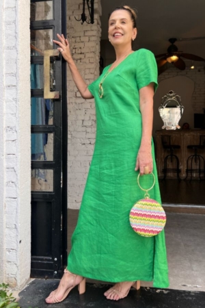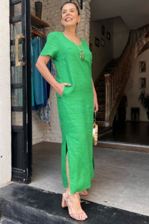 Vestido Confeccionado Em Linho, Modelo Reto, Decote V Com Ribana, Pence No Busto, Bolsos E Fendas Laterais. Possui Forro.