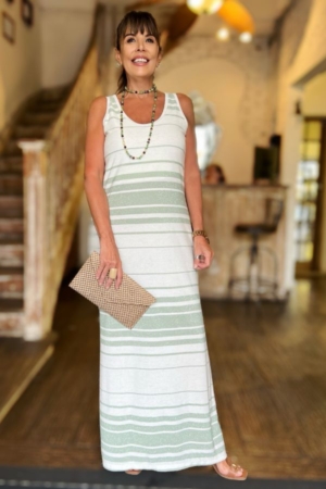 Vestido confeccionado em malha de viscolinho, com fios de lurex, decote redondo e fendas laterais. Possui forro.