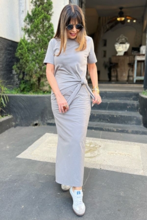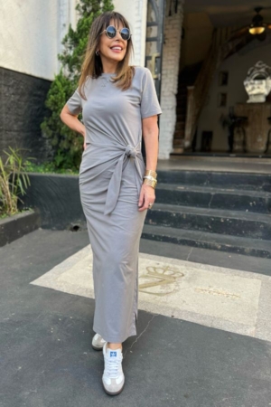 Vestido confeccionado em malha de algodão, decote redondo, mangas curtas, fendas laterais e detalhe de amarração na cintura.