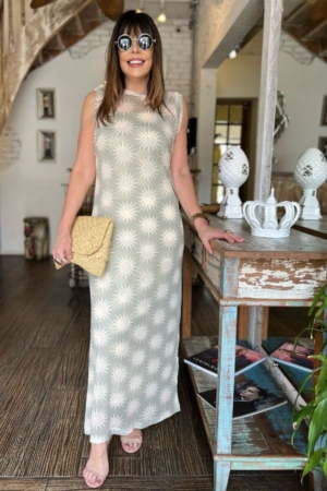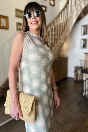 Vestido 2 em 1: confeccionado em malha canelada, alças finas e comprimento Midi. Sobreposição confeccionada em tule, gola alta estampa exclusiva da marca.