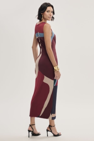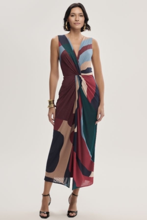 Vestido confeccionado em tule, decote V com detalhe de torção na cintura e estampa exclusiva da marca. Possui forro.