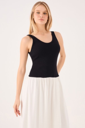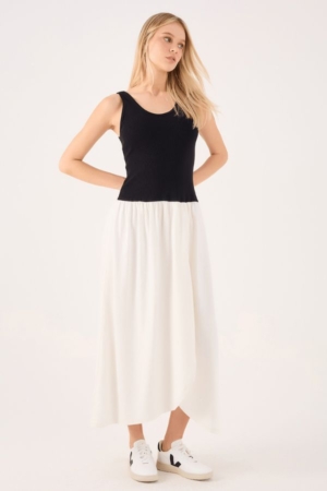 Vestido confeccionado em mix de tecidos, top em malha canelada, decote em U, alças largas, saia em malha de algodão, modelo evasê e fenda dianteira.