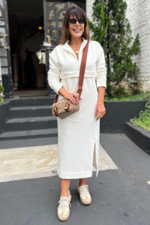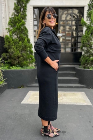 Vestido confeccionado em moletom, comprimento midi, com recorte no busto, com zíper nas laterais e decote e fenda lateral.
