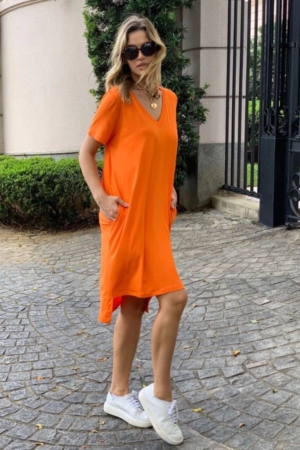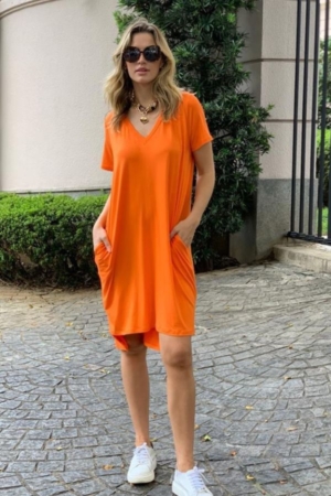 Vestido Confeccionado Em Malha De Viscose, Modelagem Ampla E Bolsos.