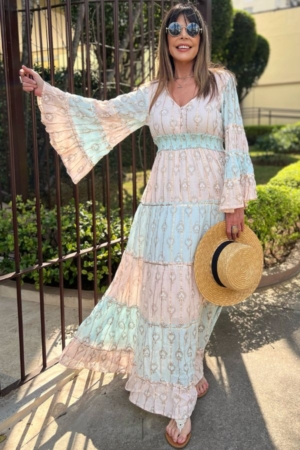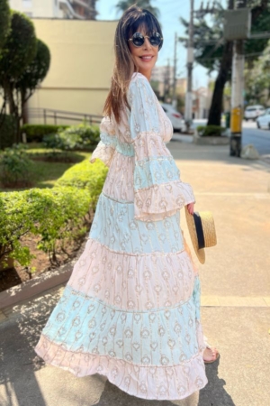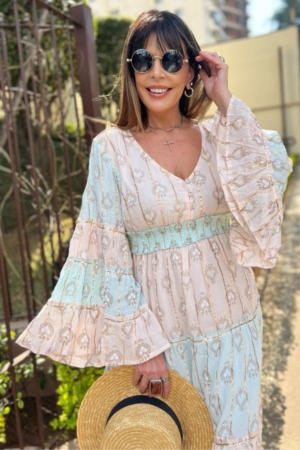 Vestido boho confeccionado em voil de viscose, decote V com fechamento por botões, mangas tipo flare, aplicação de lastex na cintura e estampa exclusiva.