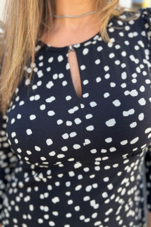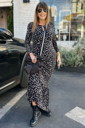 Vestido confeccionado em malha de viscose, decote redondo com recorte vazado, recorte na barra e estampa exclusiva da marca.