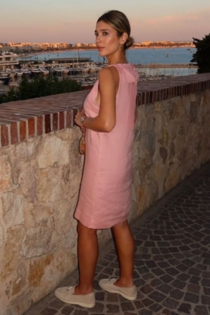 Vestido confeccionado em linho, modelo em A, recorte nas costas, fechamento por botão e laço destacável. Possui forro.