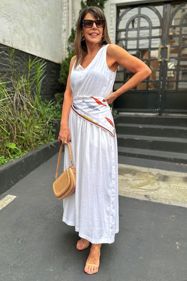 Vestido confeccionado em viscolinho, modelo midi, decote V, saia franzida e bolsos laterais. Acompanha saia combinação.