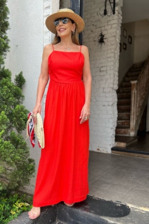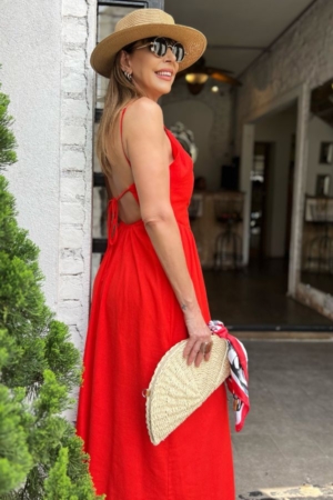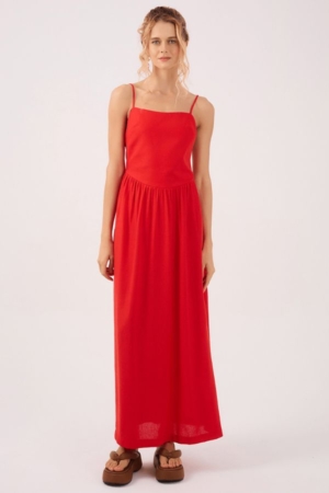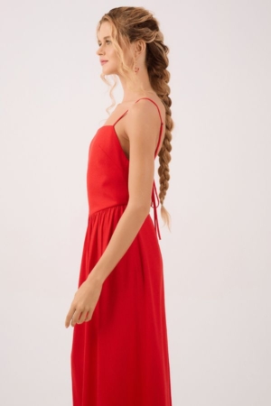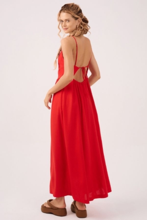 Vestido confeccionado em viscoslinho, com recorte na cintura, alças finas com amarração nas costas e franzido na saia.