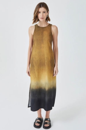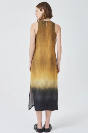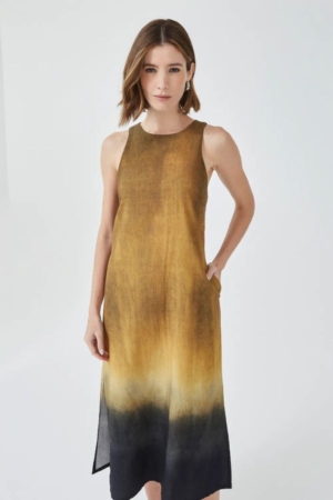 Vestido confeccionado em viscose mista, modelo midi, recorte em gota no decote traseiro, fenda e bolsos laterais e estampa tie dye.