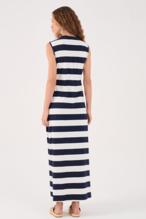 Vestido confeccionado em malha de algodão, fendas laterais, detalhe em nó com vazado na cintura e estampa em listras.
