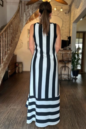 Vestido confeccionada em malha moletinho, decote redondo, barra assimétrica e estampa em listras.
