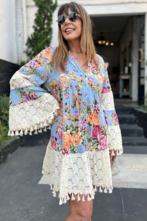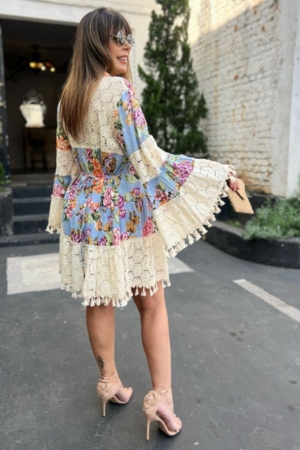 Vestido confeccionado em algodão, modelo soltinho, decote V, mangas longas, recortes em guipir com aplicação de tencel, fechamento dianteiro por botões e estampa floral.