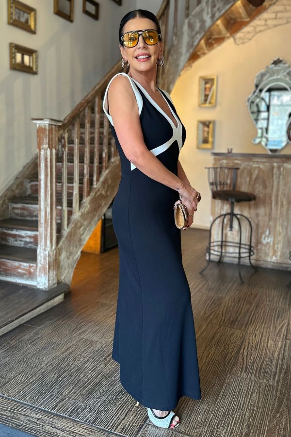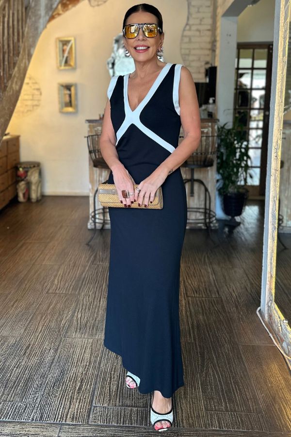 Vestido confeccionado em malha de viscose, decote V e recortes bicolor.