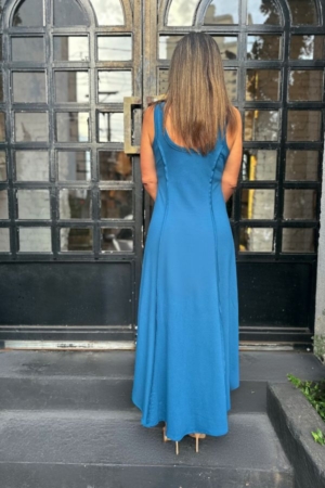 Vestido confeccionado em malha de viscose, decote redondo, modelo regata, barra arredondada e detalhe em recortes com acabamento a fio.